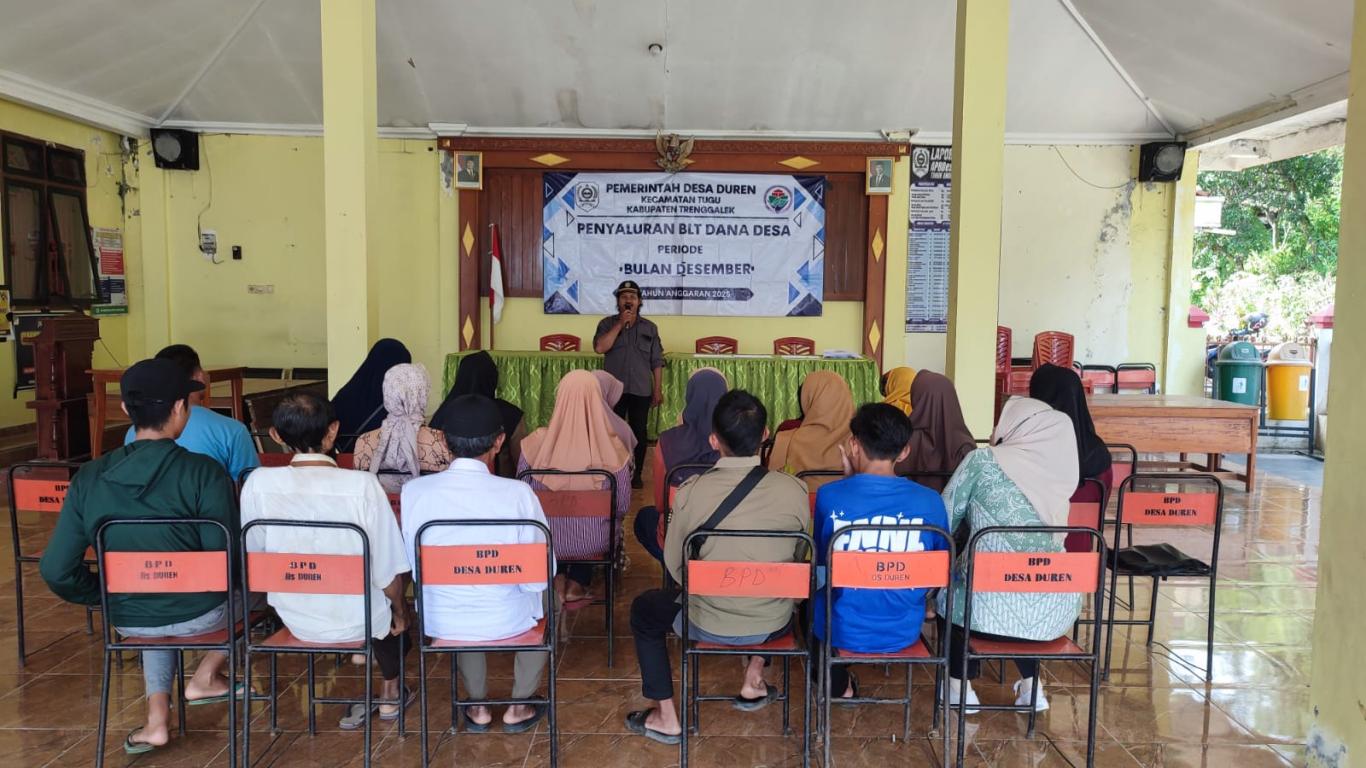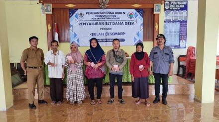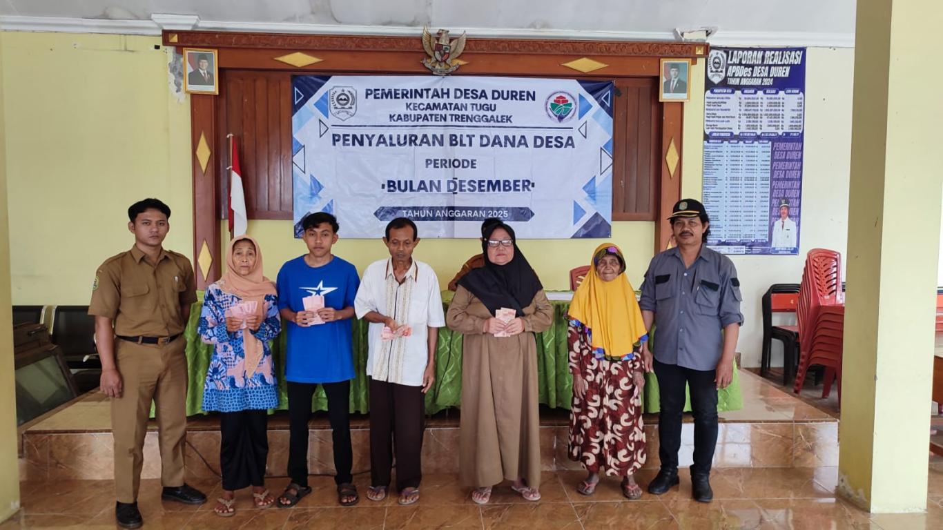 Duren, 12 Desember 2025 Pemerintah Desa Duren Kecamatan Tugu, Kabupaten Trenggalek, pada pukul 08.00 Wib kembali menyalurkan Bantuan Langsung Tunai Dana Desa ( BLT – DD ) Tahun Anggaran 2025. Sebanyak 26 Keluarga Penerima Manfaat (KPM) Desa Pengulon menerima Bantuan Langsung Tunai Dana Desa (BLT-DD) Untuk Bulan Desember Tahun 2025 yang berlangsung di Kantor Desa Duren. Sebanyak 26 Keluarga Penerima Manfaat ( KPM ) Desa Pengulon kembali mendapatkan Bantuan BLT-DD sebesar 300.000 Per Bulannya.