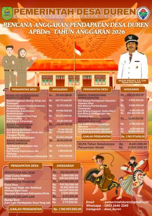 Dalam rangka mewujudkan transparansi dan akuntabilitas pengelolaan Keuangan dan penyelenggaraan Pemarintahan Desa, Pemerintah Desa Duren menyampaikan Laporan Penyelenggaraan Pemerintah Desa Tahun 2025 serta mempublikasikan kepada masyarakat. Selain sudah menjadi kewajiban Kepala Desa,hal ini juga sebagai salah satu sarana menyebarluaskan informasi Penggunaan Dana yang ada di Pemerintahan Desa Duren kepada masyarakat secara umum yang dapat diakses oleh siapapun.